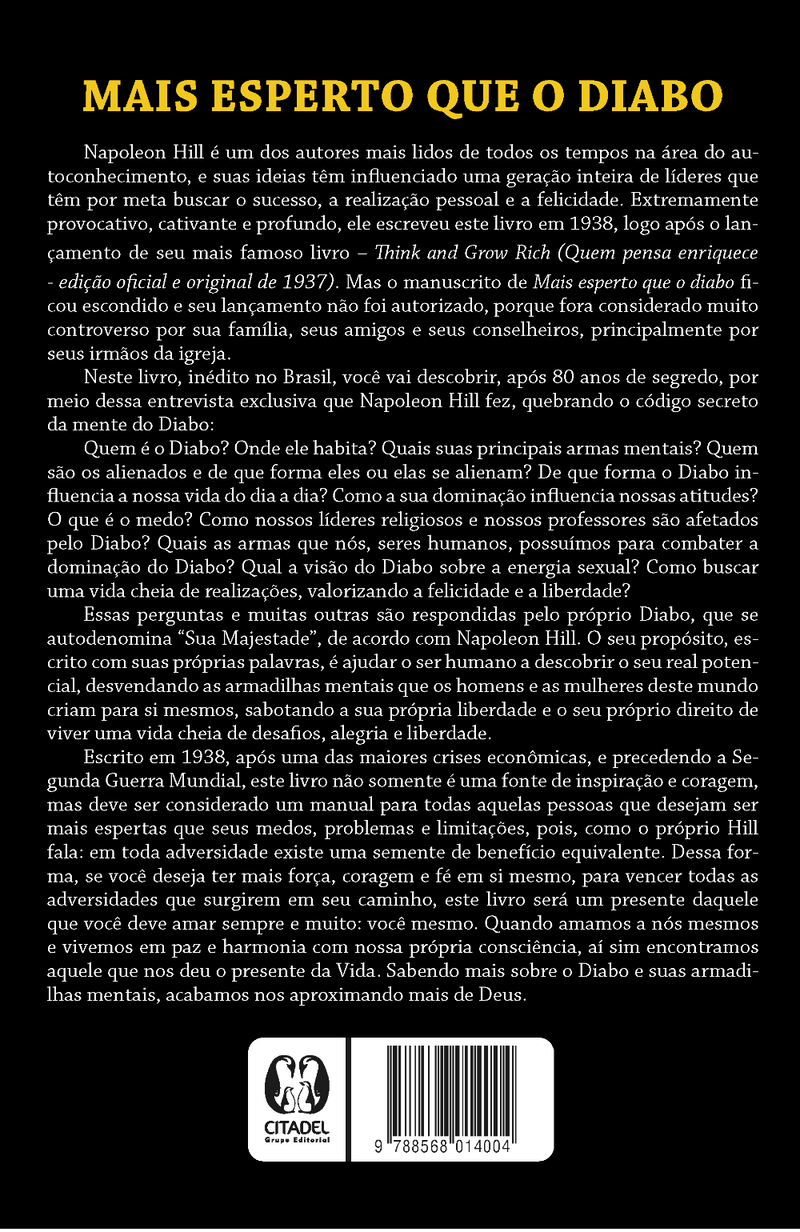 Neste livro, inédito no Brasil, você vai descobrir, após 75 anos de segredo, por meio dessa entrevista exclusiva que Napoleon Hill fez, quebrando o código secreto da mente do Diabo: Quem é o Diabo? Onde ele habita? Quais suas principais armas mentais? Quem são os alienados e de que forma eles ou elas se alienam? De que forma o Diabo influencia a nossa vida do dia a dia? Como a sua dominação influencia nossas atitudes? O que é o medo? Como nossos líderes religiosos e nossos professores são afetados pelo Diabo? Quais as armas que nós, seres humanos, possuímos para combater a dominação do Diabo? Qual a visão do Diabo sobre a energia sexual? Como buscar uma vida cheia de realizações, valorizando a felicidade e a liberdade? Essas perguntas e muitas outras são respondidas pelo próprio Diabo, que se autodenomina Sua Majestade , de acordo com Napoleon Hill. O seu propósito, escrito com suas próprias palavras, é ajudar o ser humano a descobrir o seu real potencial, desvendando as armadilhas mentais que os homens e as mulheres deste mundo criam para si mesmos, sabotando a sua própria liberdade e o seu próprio direito de viver uma vida cheia de desafios, alegria e liberdade. Escrito em 1938, após uma das maiores crises econômicas, e precedendo a Segunda Guerra Mundial, este livro não somente é uma fonte de inspiração e coragem, mas deve ser considerado um manual para todas aquelas pessoas que desejam